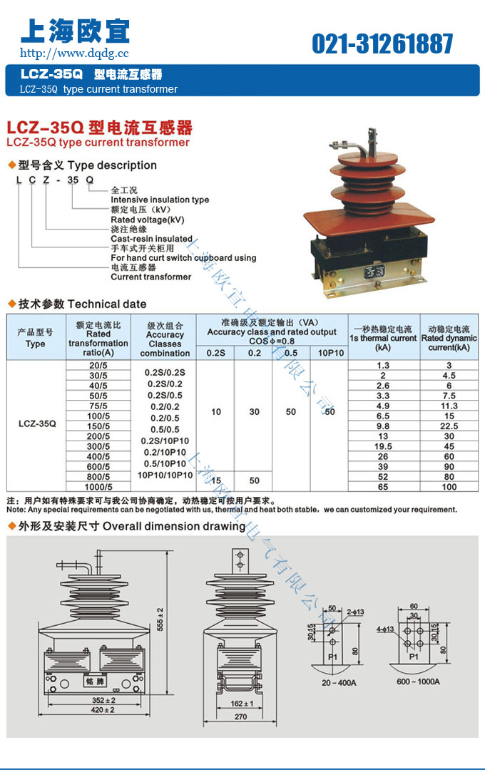 LCZ-35型電流互流器為半封閉支柱式結(jié)構(gòu),、LCZ-35Q、LCZ-35G型為全工況,全封閉式,一次繞組澆于環(huán)氧樹(shù)脂內(nèi),外裝二次繞組及鐵心。LCZ-35Q型電流互感器加強(qiáng)了外絕緣,為工況型產(chǎn)品。LCZ-35G適用于寬度為1.2米的開(kāi)關(guān)柜。