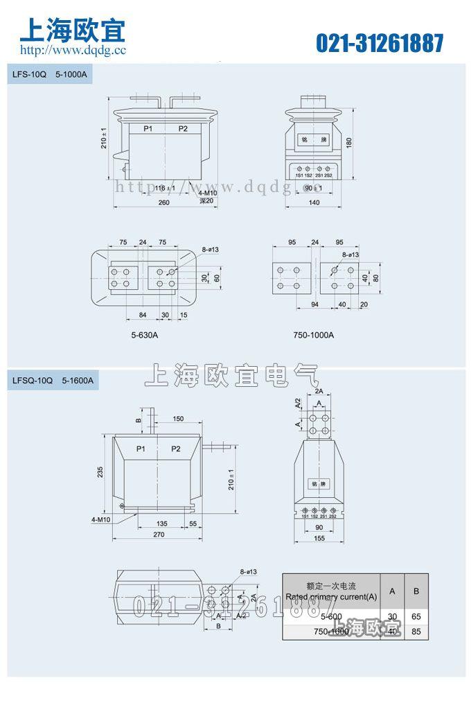 0.5(S)/10P1010 10 15 100I1n 250 I1n 250 27 67.5 300 36 80 400 45 90 500、600 56 100 750、800 63 100 1000 80 130 LFSB-10 5-200 0.2/10P10 10 10 20 80I1n 200 I1n 300 0.5/10P10 21 50 400 24 60 600 30 70 800 40 75 四、LFSQ-10Q電流互感器外形及安裝尺寸、型號(hào)含義