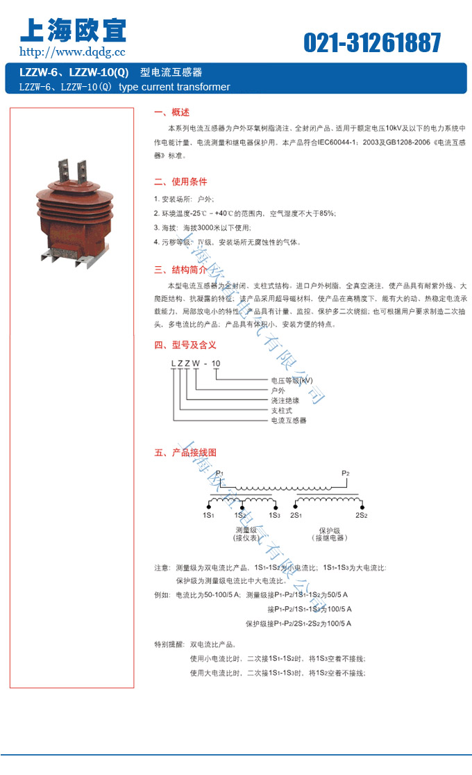 聲明:這里是產品的接線圖、變比、參數、精度、準確級、保護級、作用原理、外形尺寸等詳細參數頁面。本頁LZZW-10Q電流互感器的信息僅供參考,如有改動不另行通知。訂購前請來電咨詢,我們有專業(yè)人士為您選型。 另外可根據客戶需求,訂制非標產品。