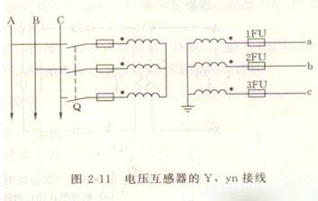 (2) 用兩臺(tái)單相互感器接成不完全星形,也稱V—V接線,用來(lái)測(cè)量各相間電壓,但不能測(cè)相對(duì)地電壓,廣泛應(yīng)用在20KV以下中性點(diǎn)不接地或經(jīng)消弧線圈接地的電網(wǎng)中。